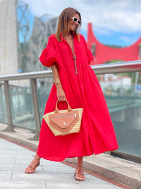 The Dress Phoebe Red is a stylish and comfortable garment made from 100% Egyptian cotton. With a one size fits all design, this dress is suitable for a range of sizes from 34 to 42 in the German size system (see: tab sizes). Measuring a length of 130 cm, this dress is perfect for any occasion. The fabric belt is attached to the dress. Use machine washes at 30 degrees for easy care and maintenance.